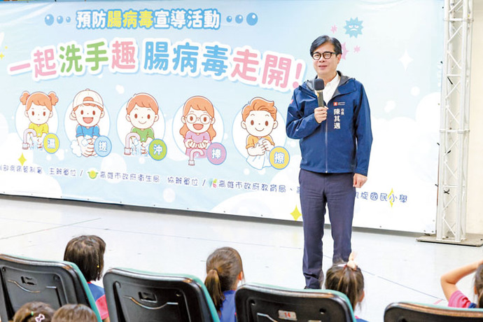 市長陳其邁強調,使用酒精或乾洗手無法有效消除腸病毒,他呼籲學校、家長應定期進行環境清潔與消毒、維持良好衛生習慣,並落實以肥皂勤洗手等作為,才能有效清除腸病毒,守護家中寶貝的健康。