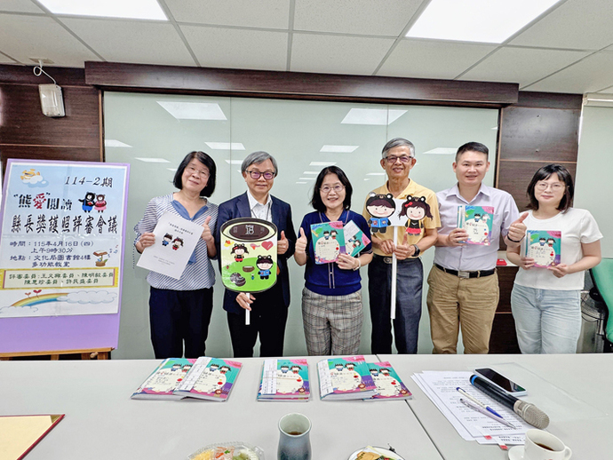 圖:南投縣政府文化局邀請兒童閱讀、兒童文學、美術專家組成評審團完成「熊愛閱讀」第13期的護照認證了合影。 (記者李光曜/攝)