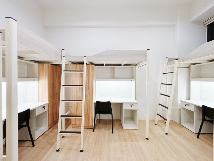 重新規劃後的空間,不僅提供學生個人化的學習與收納區域,也設置舒適的交誼廳,全棟並配置循環扇以改善潮濕問題。 整體空間兼具機能與美感,以細緻設計營造溫馨如「家」的氛圍,讓住宿師生倍感安心、擁有真正的歸屬感。
