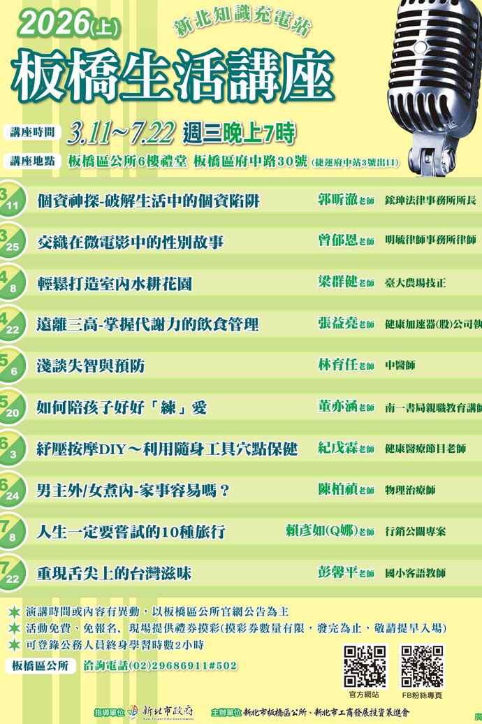 【記者林富貴/新北市報導】「板橋生活講座」又將開講!2026上半年度將於3月至7月週三晚間7時起共舉辦10場,地點在板橋區公所6樓禮堂(板橋區府中路30號)。 上半年講題包含醫學保健、樂齡關懷、法律常識、園藝植栽、異國文化、親子教育、性平教育等面向,歡迎舊雨新知一起來聽講!