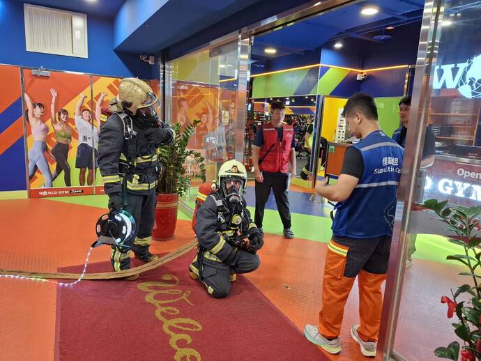 【記者林富貴/新北市報導】提升地下建築物火災搶救效能,新北市政府消防局第五救災救護大隊於4月15日,假土城區「世界健身俱樂部(海山店)」辦理實兵演練,模擬地下樓層(B1)火災發生後濃煙密佈情境,針對「空間迷失處置」及「無線電通訊障礙克服」進行重點訓練,強化消防人員於視線受阻環境下之搜救應變能力,以確保救災行動安全順遂。