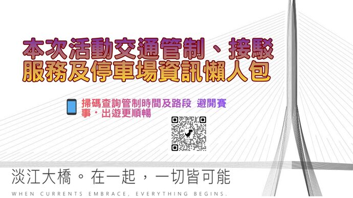 新北警呼籲,活動期間淡水漁人碼頭及淡江大橋周邊交通負荷將明顯增加,請用路人提前改道行駛台2線、台64線等替代道路;另建議民眾多利用捷運、輕軌及接駁車等大眾運輸工具前往。 警方並表示,將持續視現場人車流狀況機動調整交通管制措施,請民眾配合現場警察及工作人員指揮,共同維護交通順暢與活動安全。 民眾均可透過QRCode即時查詢本次活動交通管制、接駁服務及停車場等資訊。