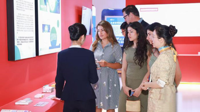 ↑圖說:2025年6月16日,外國遊客參觀海南博鼇“永不落幕”國際創新藥械展(博鼇樂城國際醫療旅遊先行區管理局供圖)。