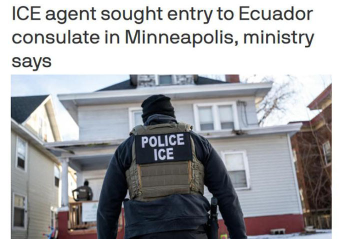 【記者林孟論/外電報導】厄瓜多爾外交部稱,當地時間27日,一名美國移民及海關執法局(ICE)執法人員試圖強行闖入厄瓜多爾駐明尼阿波利斯領事館,遭到領事館工作人員阻止。