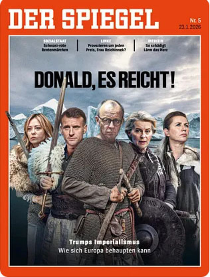 封面圖上展示了五位歐洲領導人的照片,德國總理默茨、法國總統馬克龍、歐盟委員會主席馮德萊恩、丹麥首相弗雷澤里克森和義大利總理梅洛尼,他們被畫成身穿獵人服裝,手持武器的形象,背後背景看似是格陵蘭島冰川。