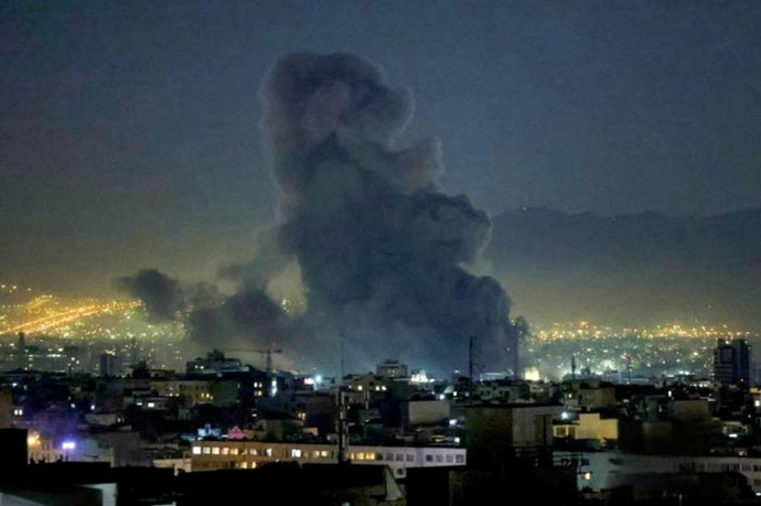 ↑圖說:伊朗首都德黑蘭多地遭襲,部分建築冒出濃煙(供圖)
