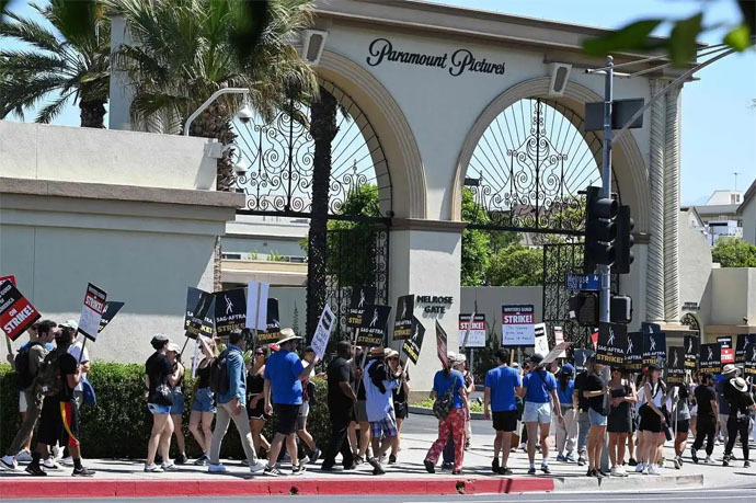 ↑圖說:當地時間2023年7月20日,美國加州好萊塢的派拉蒙影城外,美國編劇工會和美國影視演員工會成員以及支持者們組成罷工隊(資料圖)。