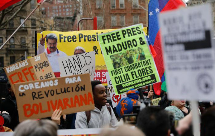 ↑圖說:當地時間3月26日,委內瑞拉總統馬杜羅的支持者聚集在美國紐約南區聯邦法院外抗議,委內瑞拉總統馬杜羅及其妻子預計於當日上午在紐約“出庭受審”(供圖)。