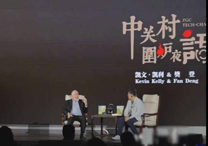 ↑圖說:世界著名科技雜誌《連線》創始主編凱文·凱利在論壇上發言(視頻截圖)。