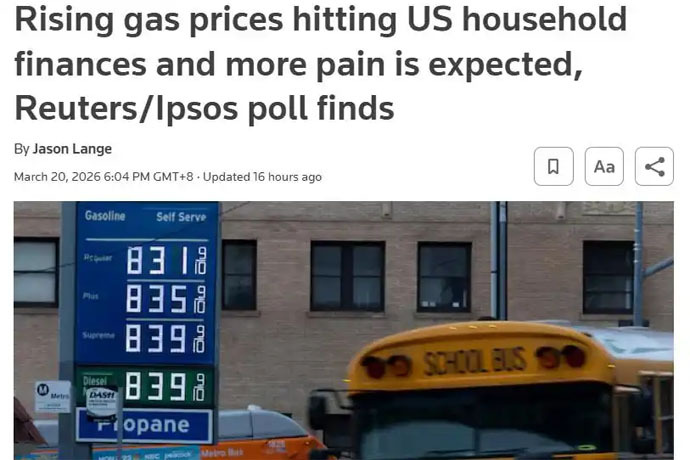 ↑圖說:路透社3月20日援引路透社/益普索最新民調顯示,隨著美以伊衝突推高油價,戰爭帶來的壓力已開始直接衝擊美國家庭(路透社報導截圖)。